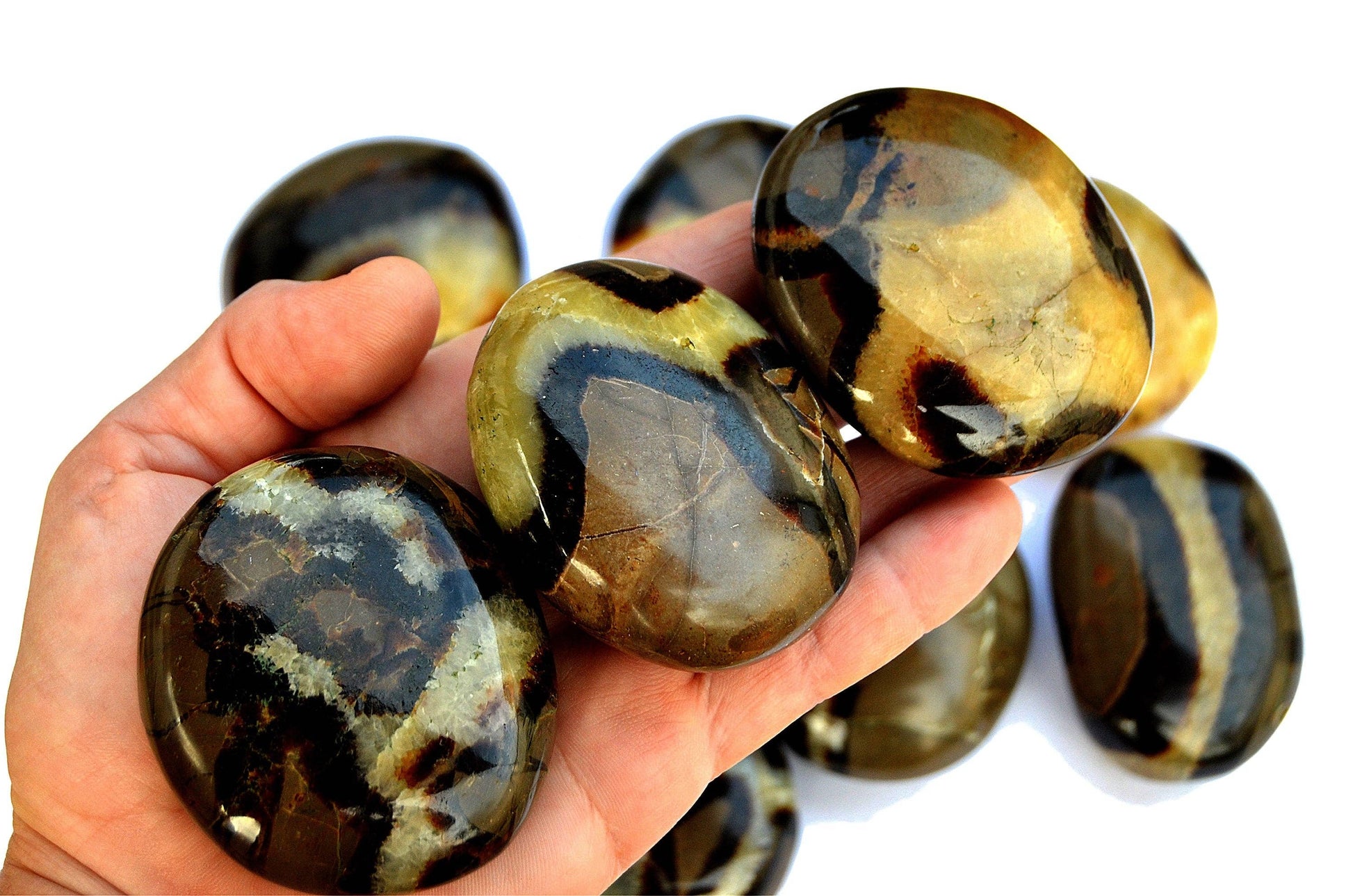 Natürlicher septarischer Palmstein. Sie erhalten einen septären Kristallkiesel, der dem im Bild oben sehr ähnlich ist und zufällig ausgewählt wird. Bitte rechnen Sie mit leichten Abweichungen in Farbe, Transparenz, Größe und Form, da es bei jedem Stein einzigartige Abweichungen gibt. Beachten Sie, dass alle Kristalle natürlich sind und daher manchmal kleine Unvollkommenheiten auftreten können.