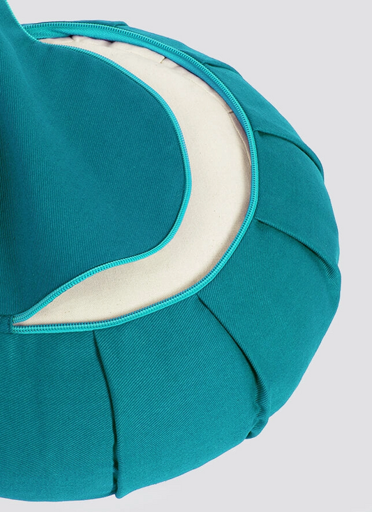 Yoga Studio EU round cushion in organic buckwheat Zafun turquoise lotus