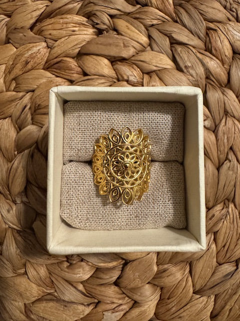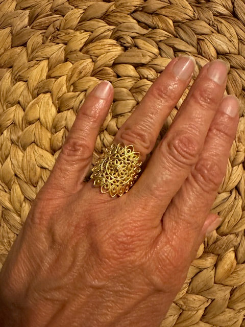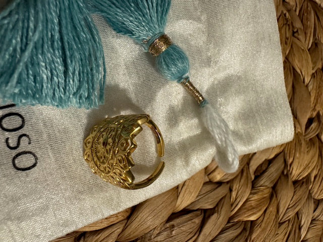 This beautiful handmade ring is made of gold plated brass and features a rose quartz gemstone. The inner size of the adjustable ring is 16 millimeters.