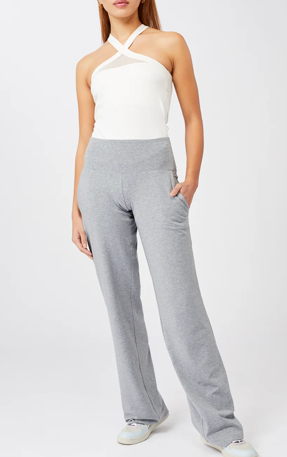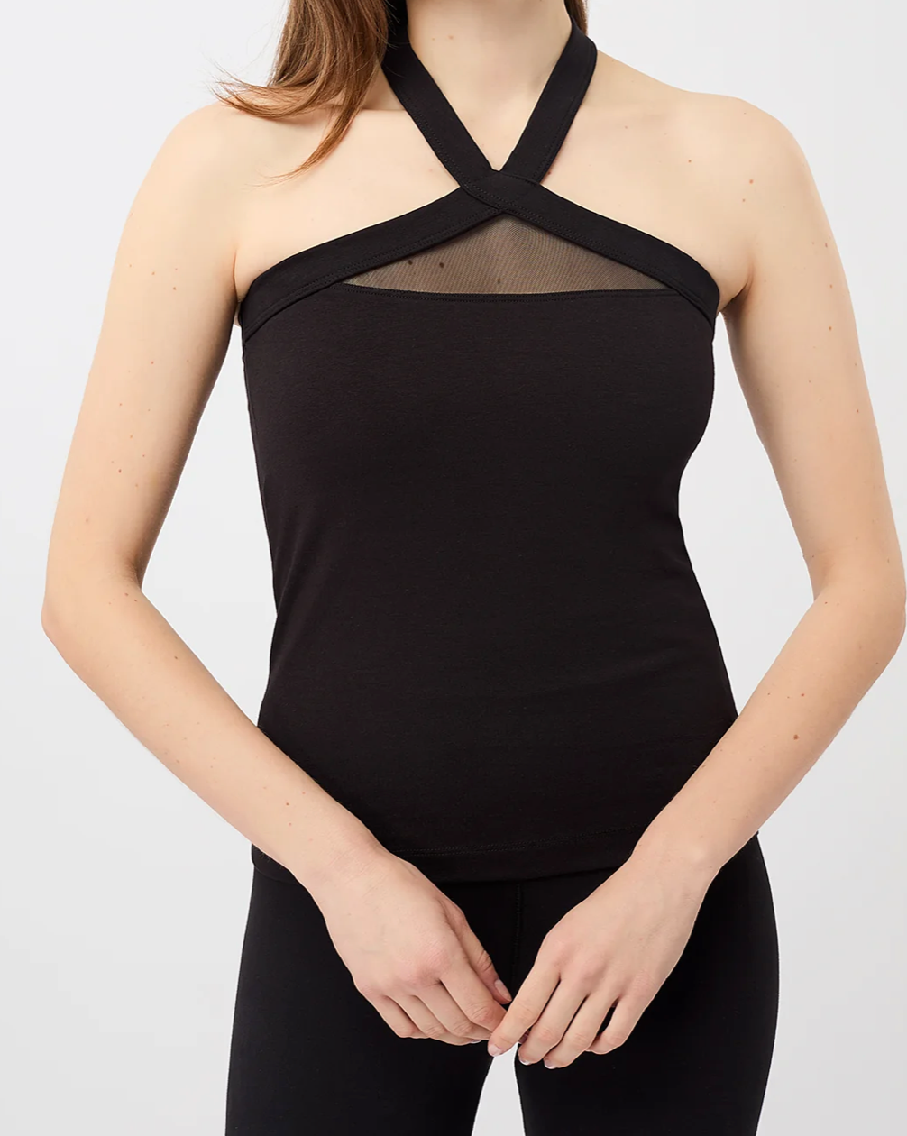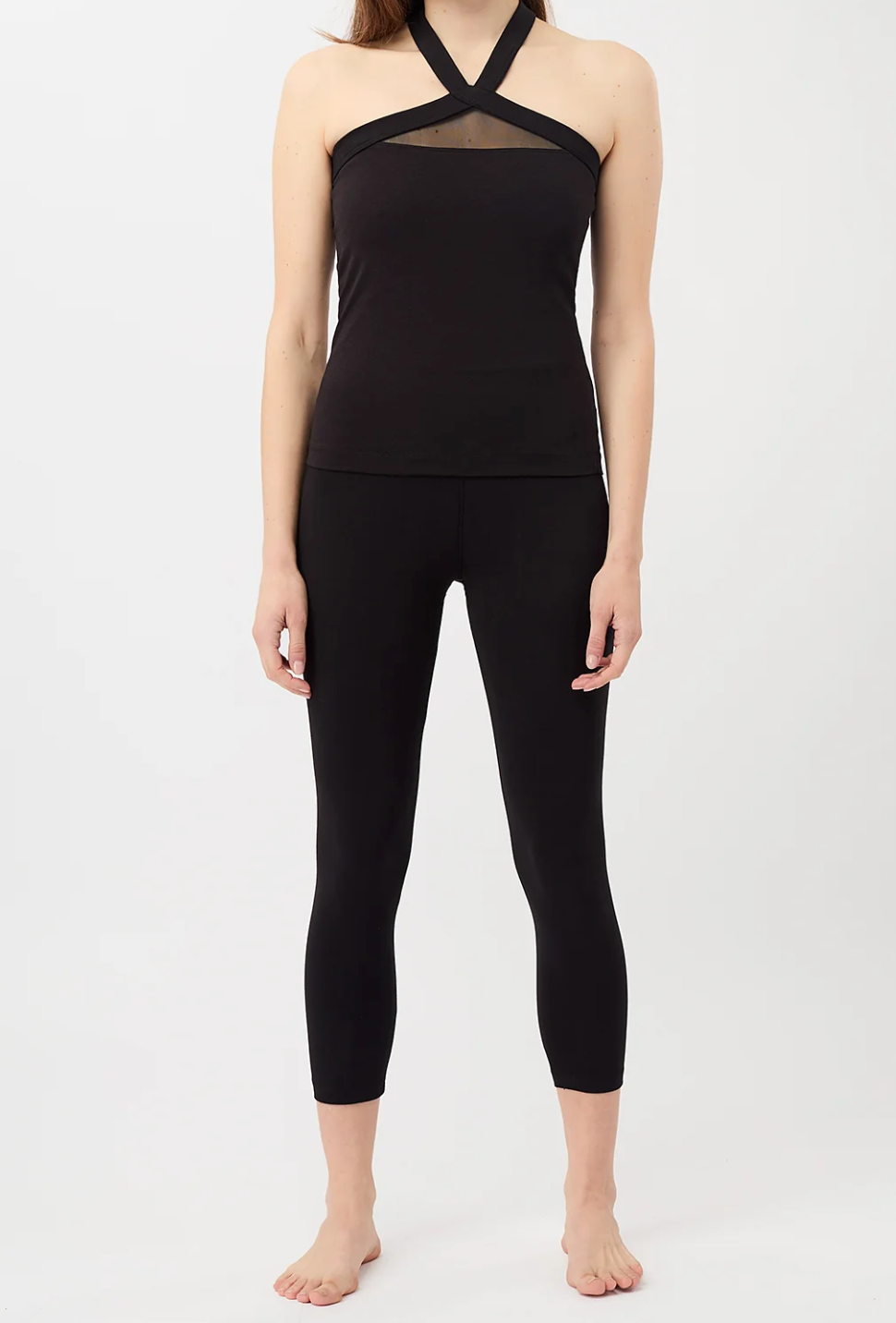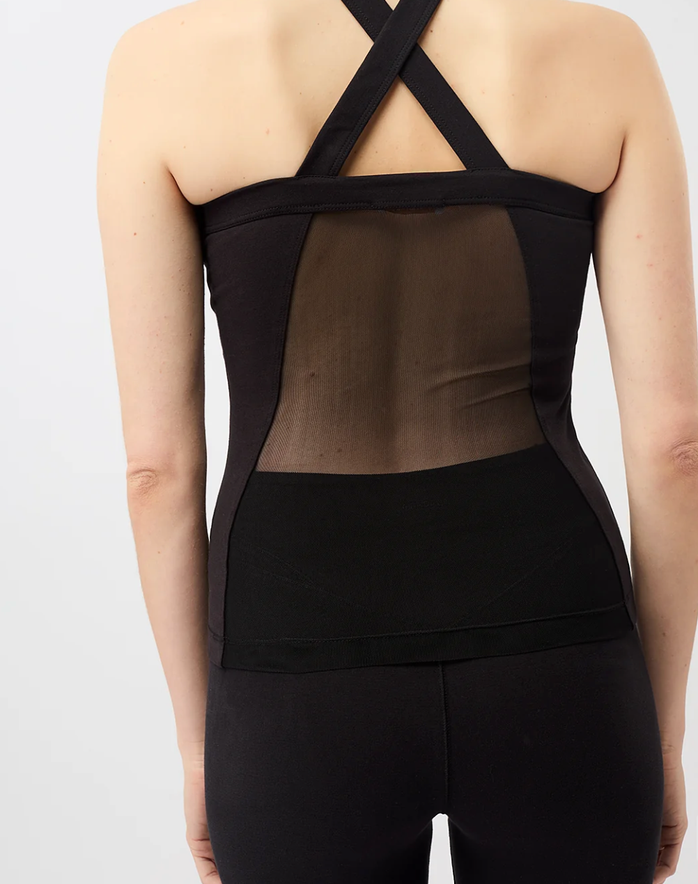 Original cut yoga top, close to the body, with transparent fabric in front and back, in jersey cotton.