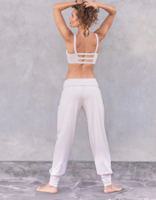 Comfortable fit yoga and leisure pants made of organic cotton with turn-ups, ruffled side pockets and gaiters. Also suitable for pregnant women in the first months. Very comfortable to wear.