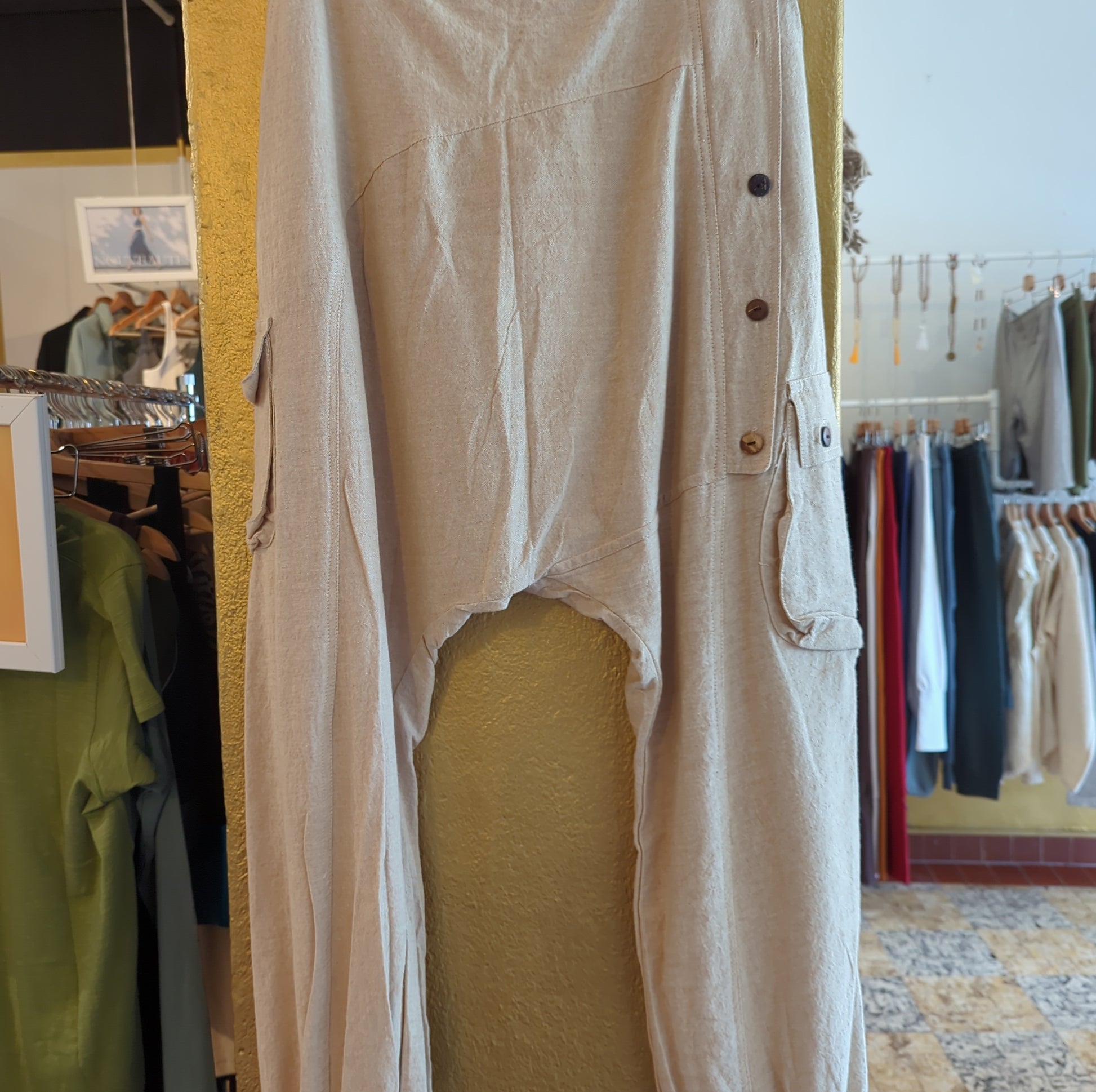 Ecru harem pants for men with a row of wooden buttons on one side of the pants. Trousers tightened at the ankles.