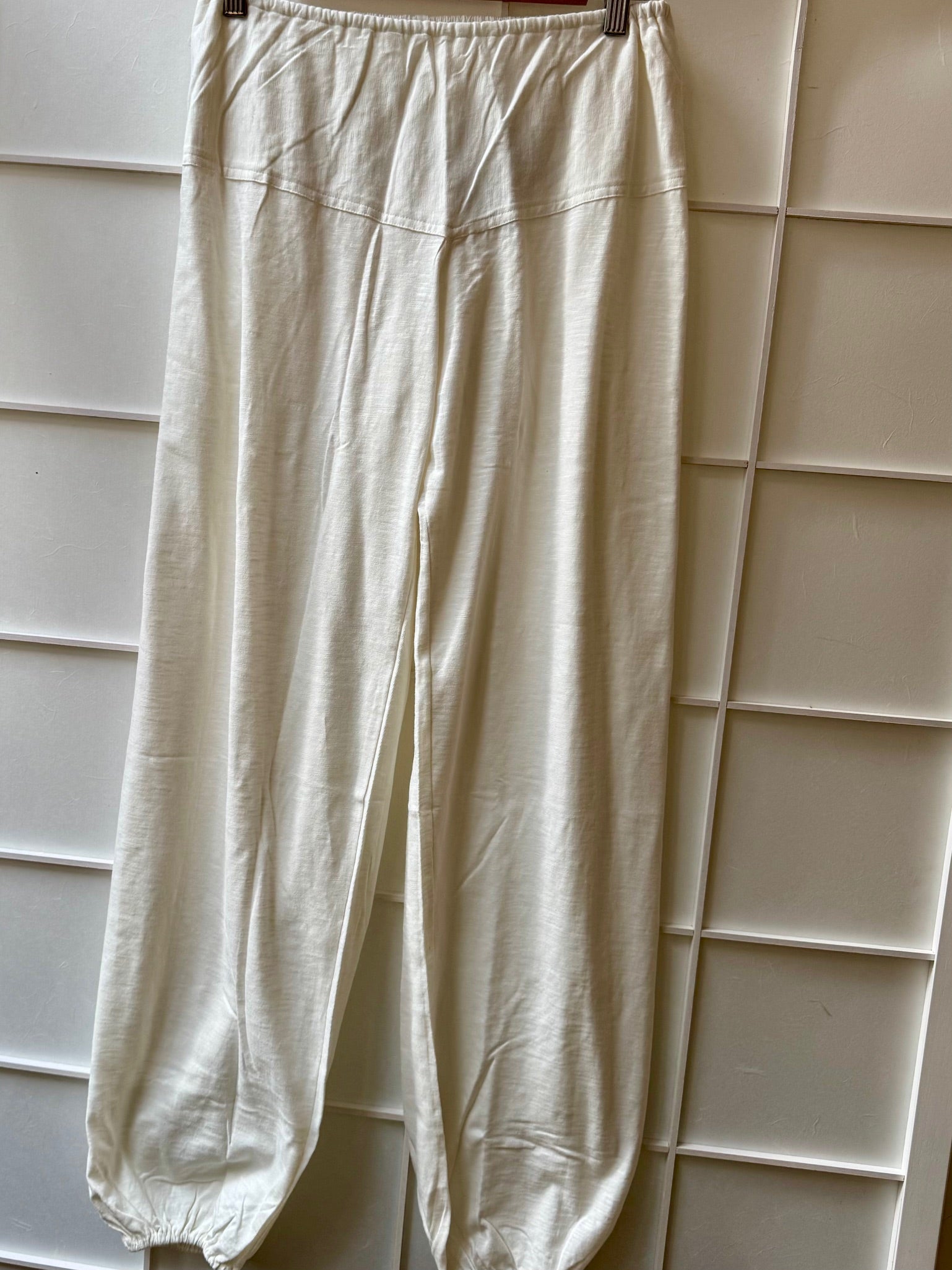 Straight cut pants with drawstring at the waist, ecru color. This model has two hand pockets.