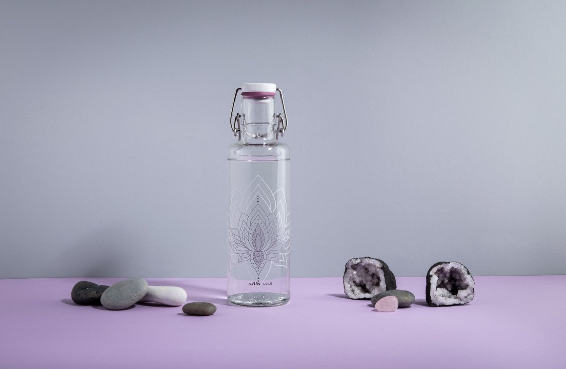 The cleanest water bottle in the world. 100% plastic free with a beautiful Flower of Life design. Italian glass and German closure. For every soulbottle sold, 1 euro will be donated to water cleaning projects. The Impressions on the bottle and the closure are in real gold. Handwash only.