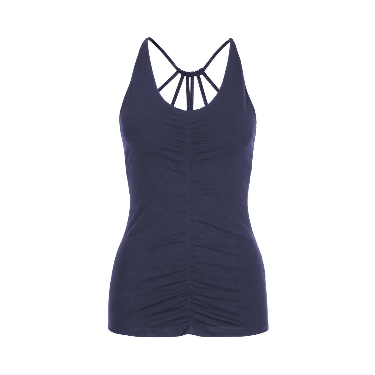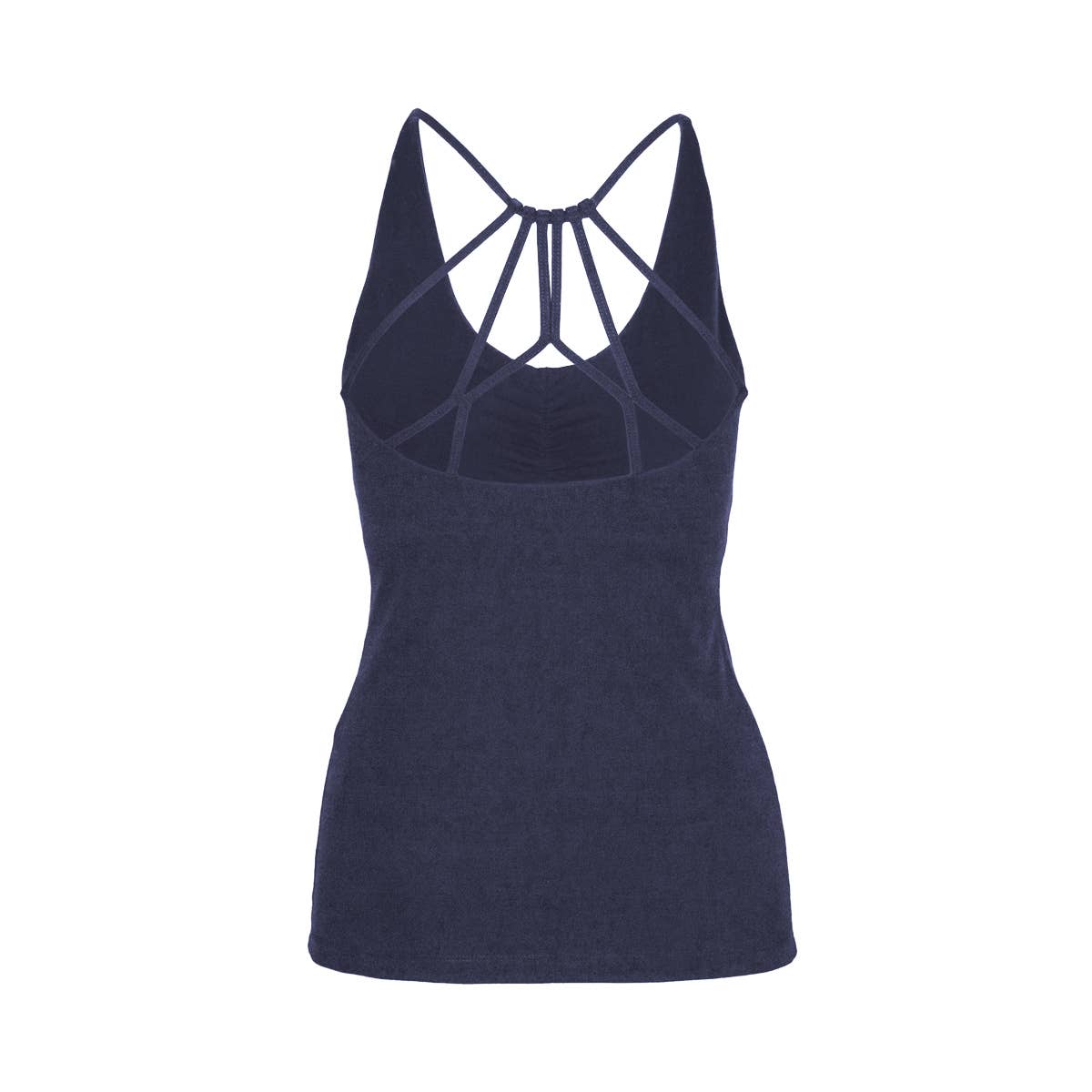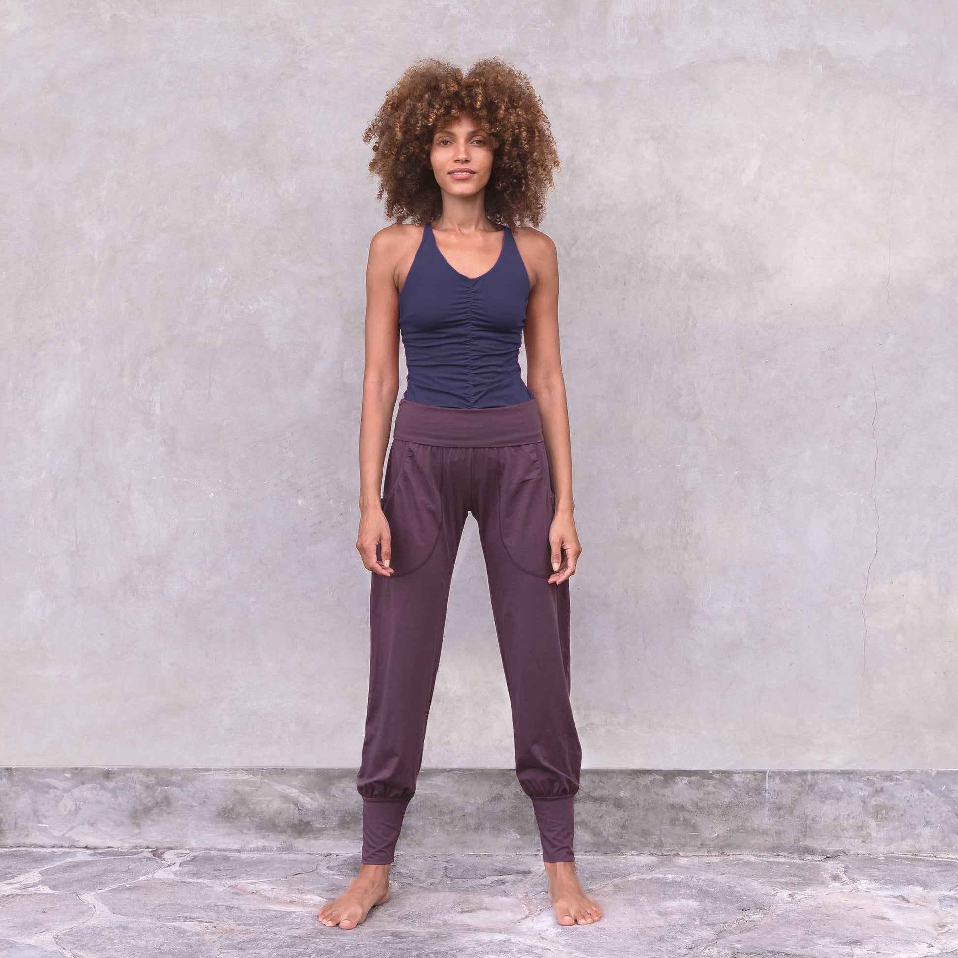 Slightly longer cut, with built-in bustier for light to medium support, in elastic organic cotton for yoga, dance and Pilates.