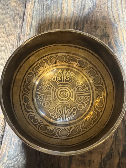 Bol chantant tibétain gravé Yin & Yang fait main en Népal avec base et clapet, 10 cm