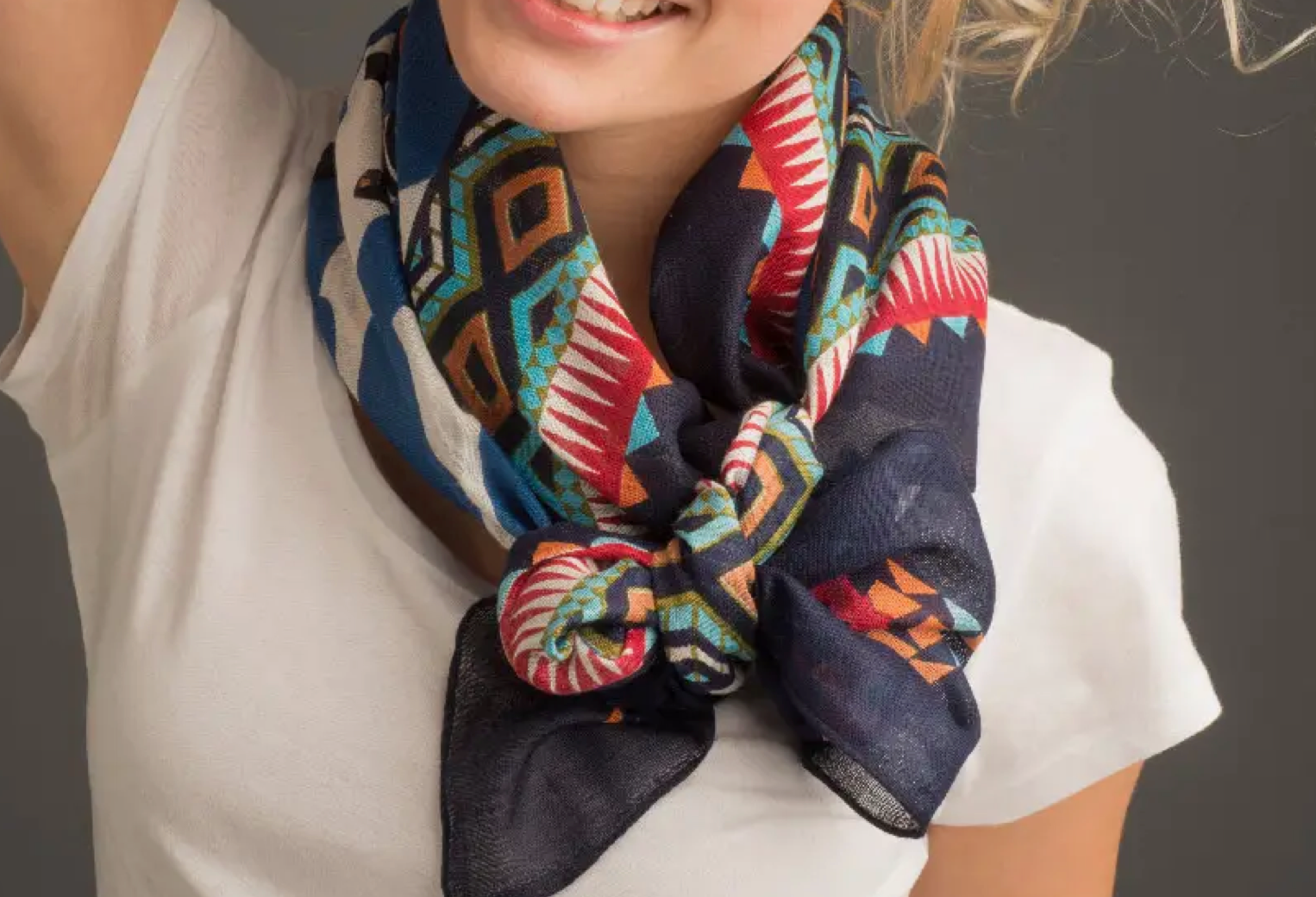 Carré en viscose bleu aux motifs ethniques multicolores.