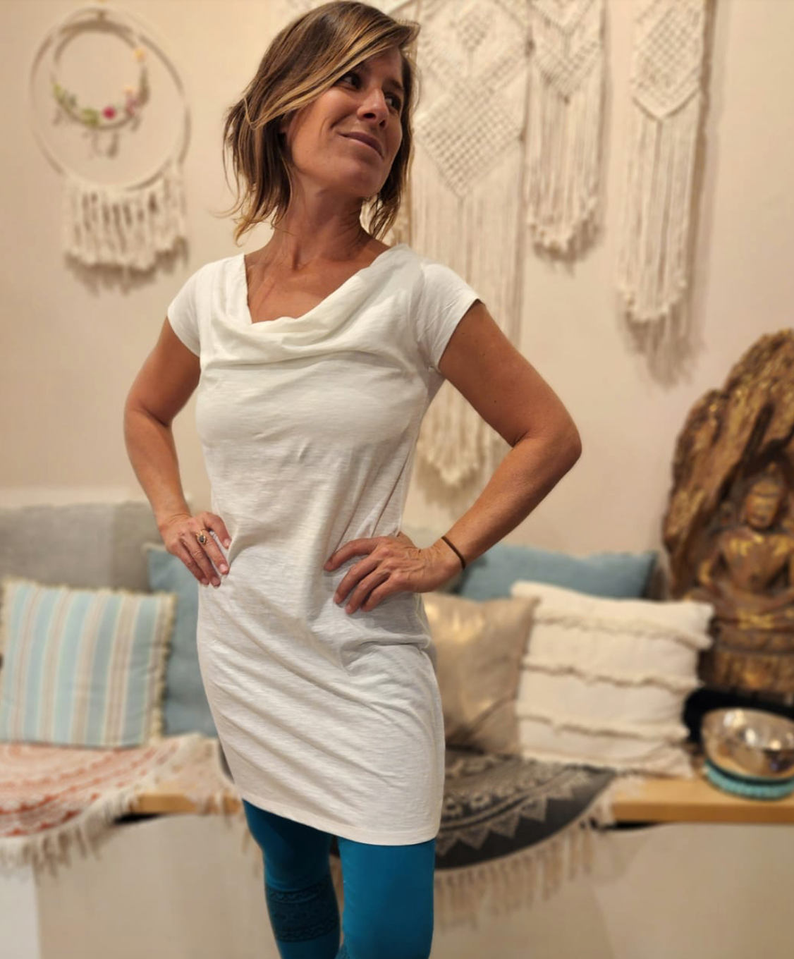 Tunique Dakini en coton biologique naturel fait avec amour en couleur écru et beige caramel avec manches courtes ainsi un petit col bateau plissé. Ce joli tunique peut être porter aussi comme mini robe à la plage ou avec un Slim Jeans comme Street Wear.
