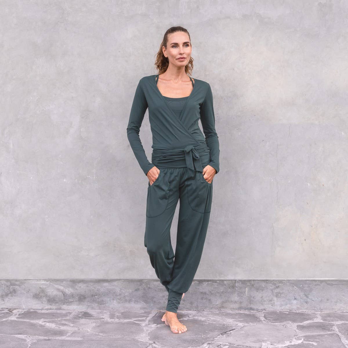 Pantalon de yoga et de loisirs à la coupe confortable en coton biologique avec revers, poches latérales volantées et guêtres. Il convient également aux femmes enceintes au cours des premiers mois.