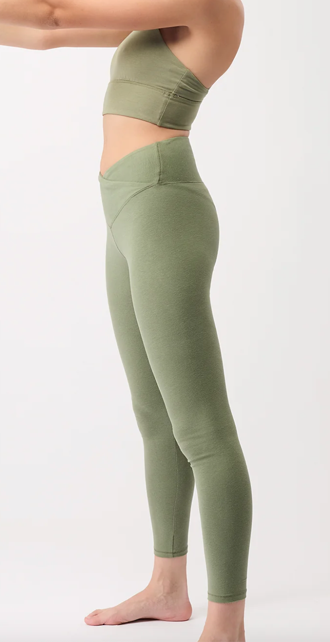 Legging taille haute en tissus Tencel - (61% Lyocell, 34% coton & 5% Elasthane) naturel biologique en couleur vert-olive pastel uni. Très facile a combiner avec d'autre couleur.